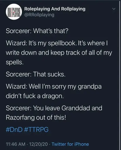 arrow-up1345arrow-down1imageThe Wizard and Sorcerer beef continueslemmy.dbzer0.comStamets@lemmy.dbzer0.com to RPGMemes @ttrpg.network · 7 days agomessage-square8linkfedilink