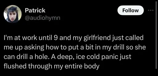 minus-squareSkunkWorkz@lemmy.worldlinkfedilinkarrow-up3·12 days agoThe only tool my wife knows how to use is me. Single handily even.