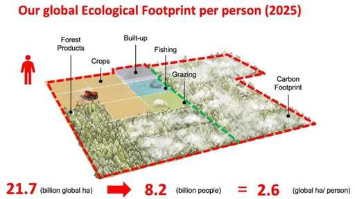 The Ecological Footprint metric shows how much nature we use compared to how much nature we have.
